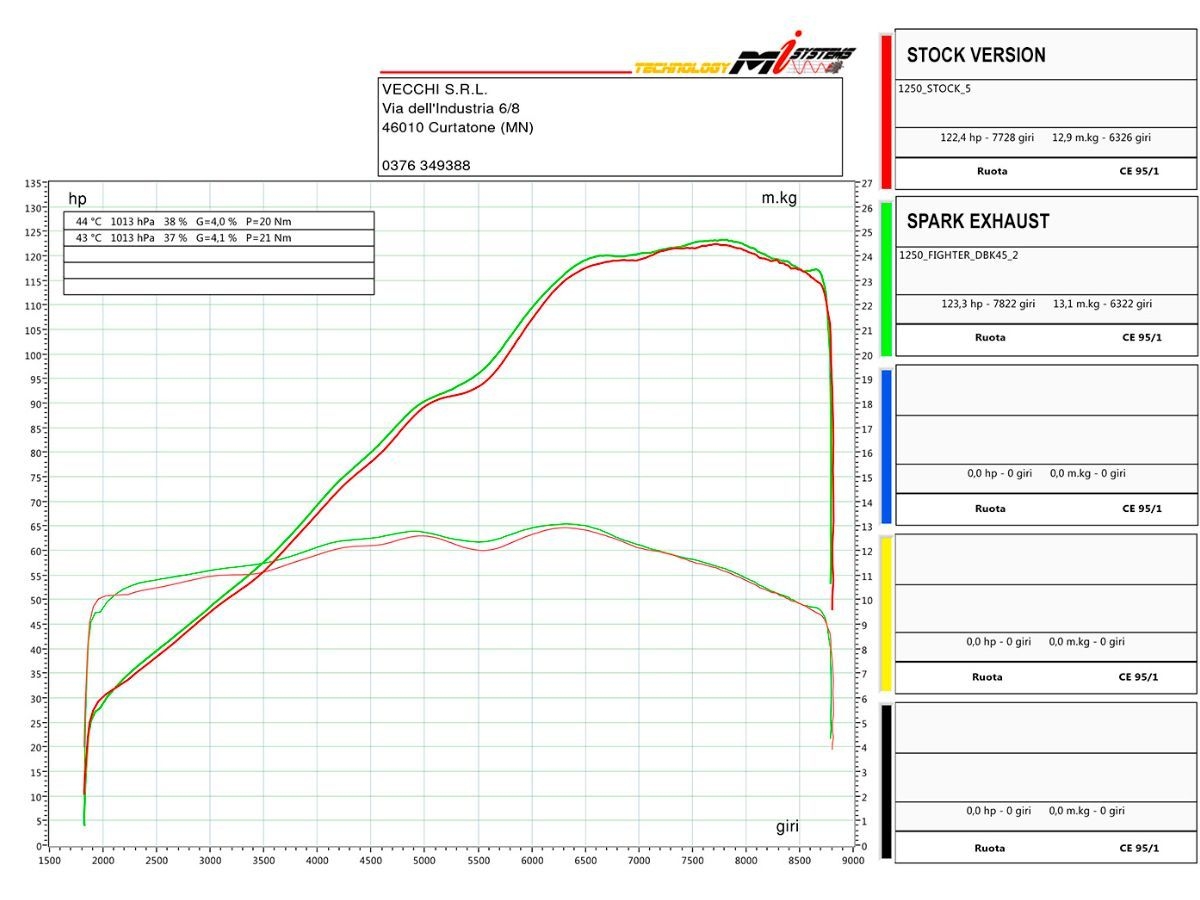 Le performance sono ottimizzate esattamente dove serve, ai medi regimi, con + 2,5 cv a 4.500 giri con il solo montaggio del silenziatore Spark su collettore e moto in configurazione completamente originale.